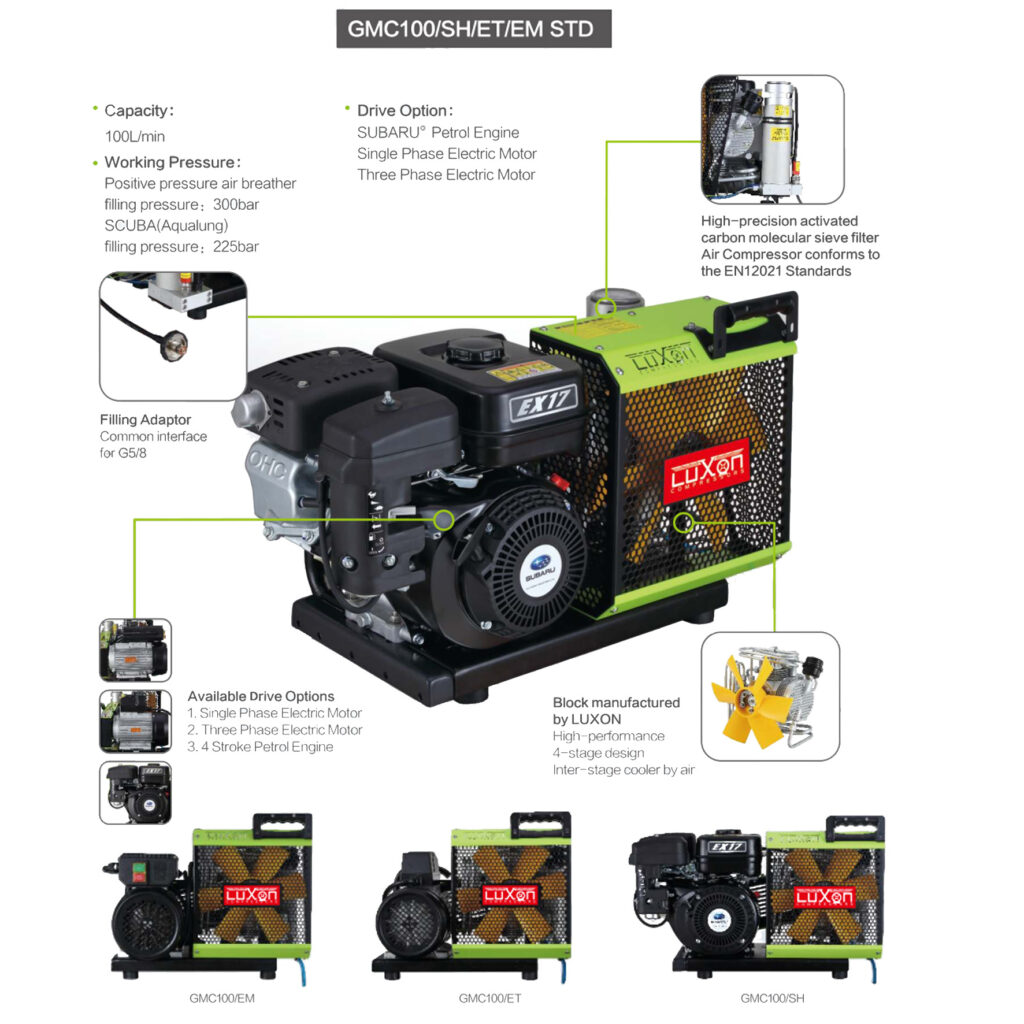 GMC Series Specifications With power line and magnetic starting switch Button or switch with start and stop Mini inlet silencer filter Oil-water separator and filter using aluminum Metal frame with spray coating Active carbon molecular sieve filter alloy integrated design Final stage safety valve offer overload protection Condensate drain valve Technical Data Catalogue